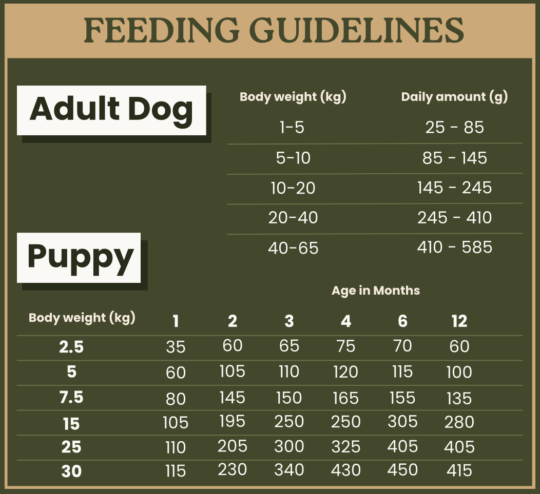 All our ingredient percentages are measured on a dehydrated basis, just before the cold-pressing process. This ensures a genuine 40/60/0 balance as fed. Unlike other brands that use ‘fresh’ ingredients (with moisture that’s lost during processing), we guarantee that what’s on the label is what’s in the food—honest, natural, and nutritious.